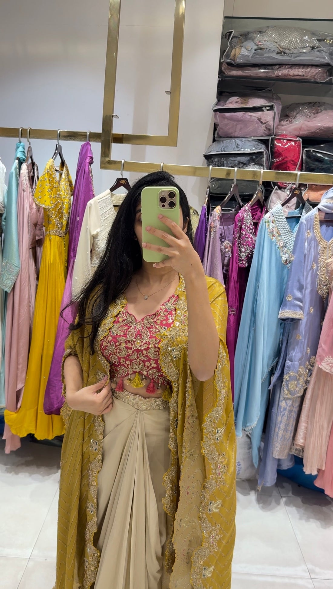 Cream Cowl Skirt Pink Blouse and Shrug With Embroidery Western Look Outfit