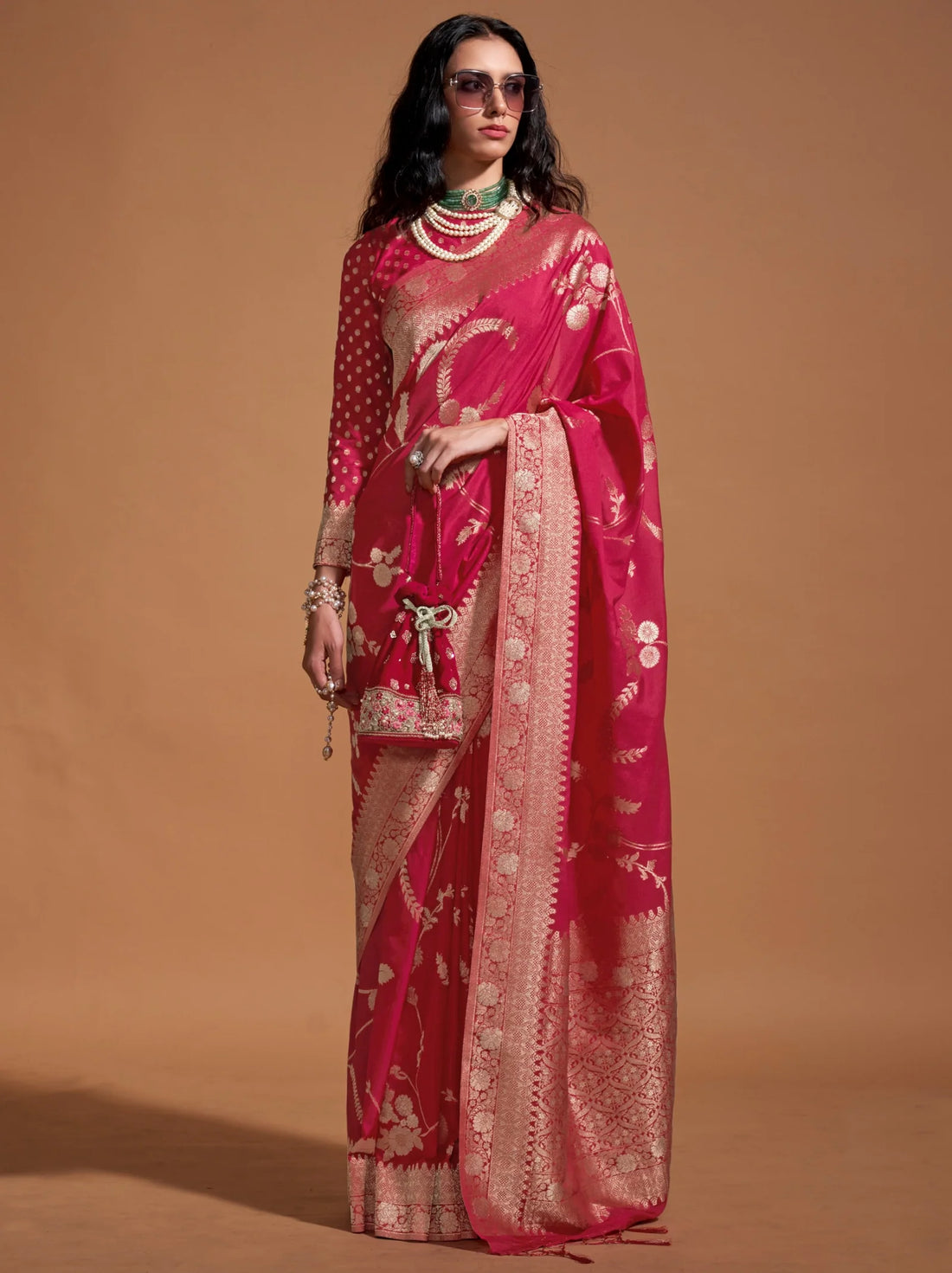 Make a stunning statement with this Rani Pink Color Tissue Silk Pre-Draped Saree. Crafted from...