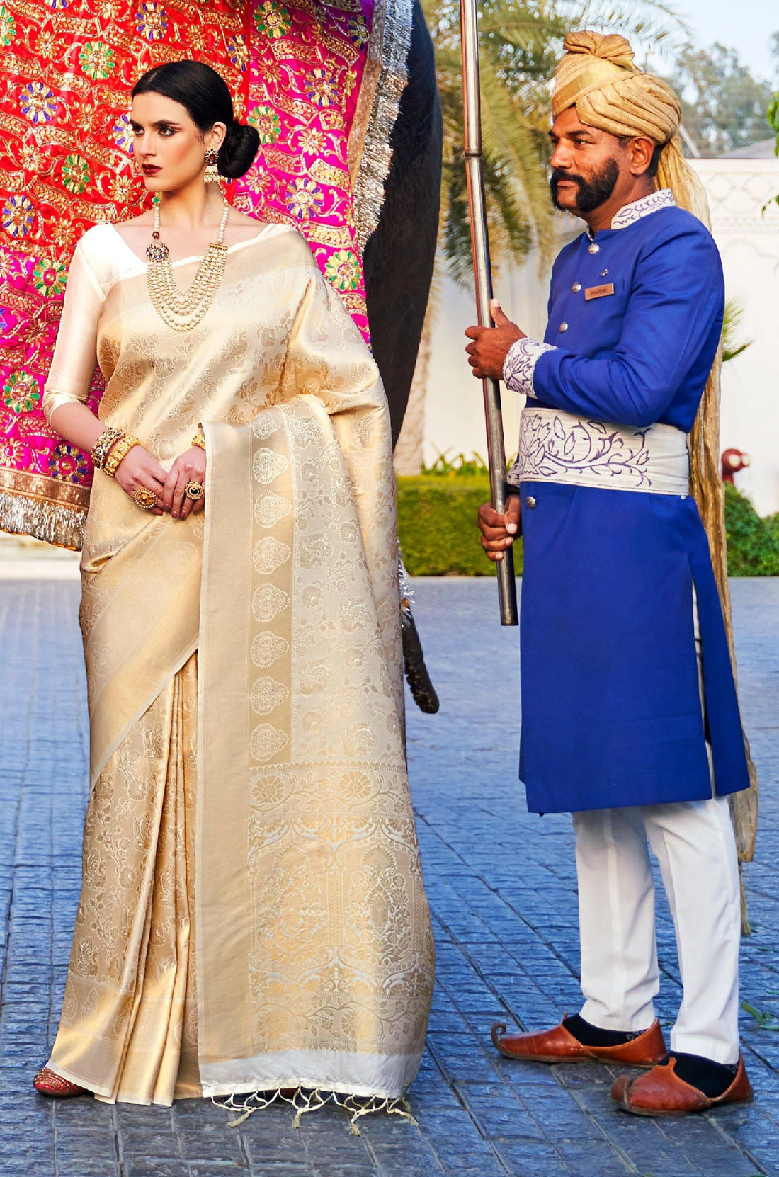 Unleash your inner goddess and make a statement with our Champagne Gold Kanjivaram Soft Silk...
