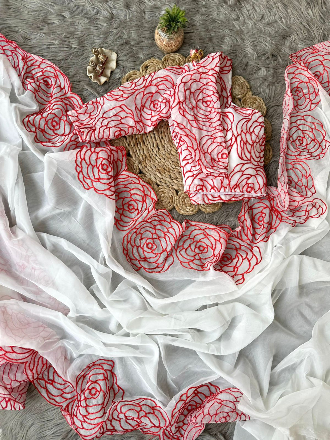 FABRIC DETAILS SAREE : Pure Soft Organza With Red Flower Thread Work. BLOUSE : Soft...