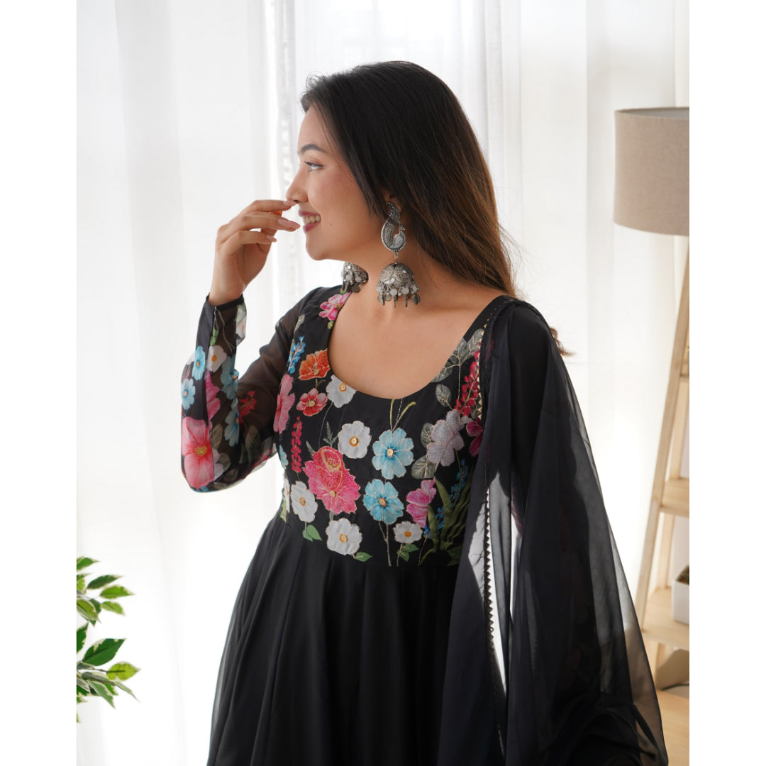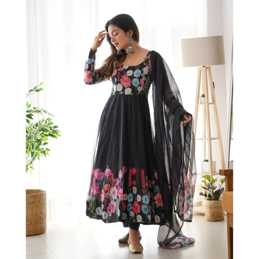 Black Color Pure Soft Organja Silk Fabric Fully Flair Kali Pattern And Canvas Patta With Dupatta Set Pent Ready To Wear
