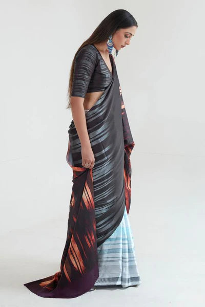 This satin crepe saree is the best addition to your wardrobe. The features of this saree make it adorning piece of garment for all occasions. The satin crepe saree has lines prints accessorizes the whole look of the apparel. Pair this saree with a stylish blouse and simple jewelry to go for a party look. This saree is a beautiful pick for a comfort garment and is best suited for office or part wear. Shop the saree online at best price!