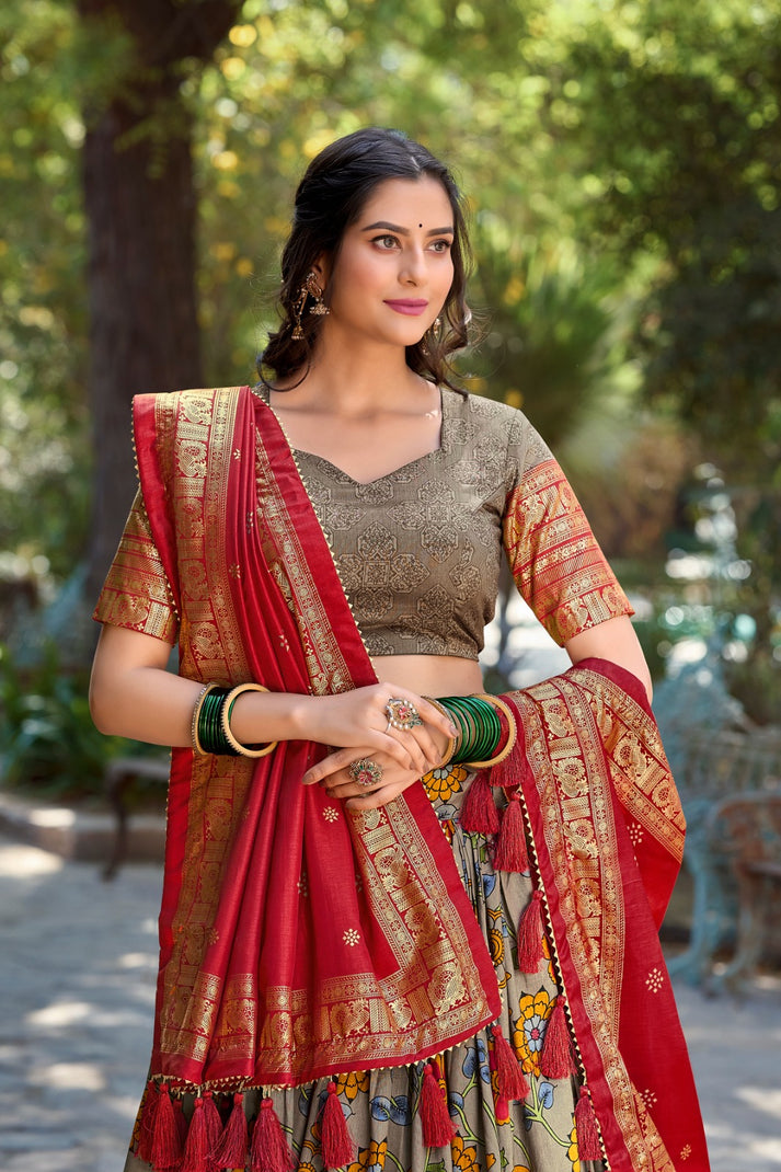 Captivating Kalamkari Print Gray Color Wedding Lehenga Choli