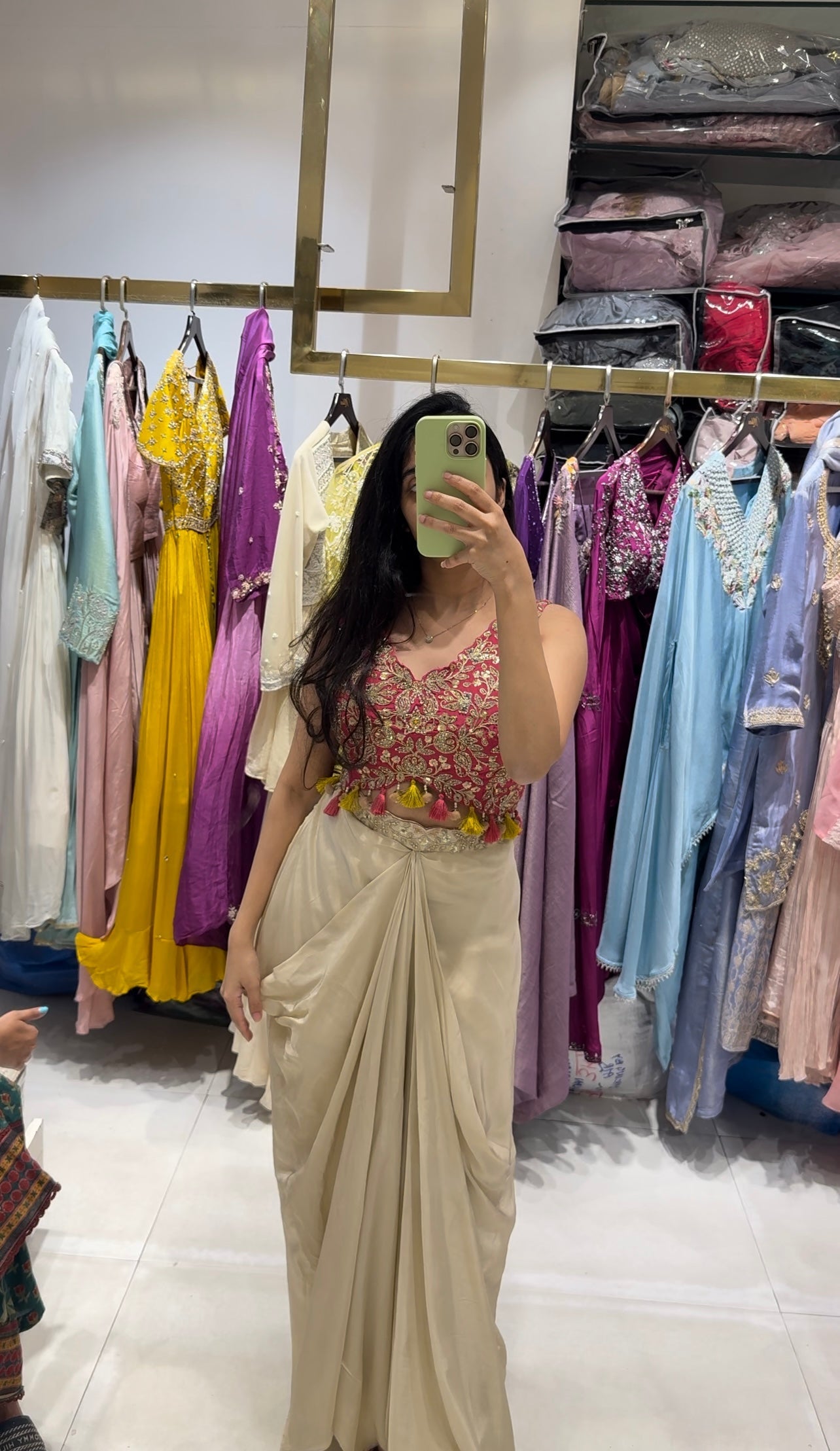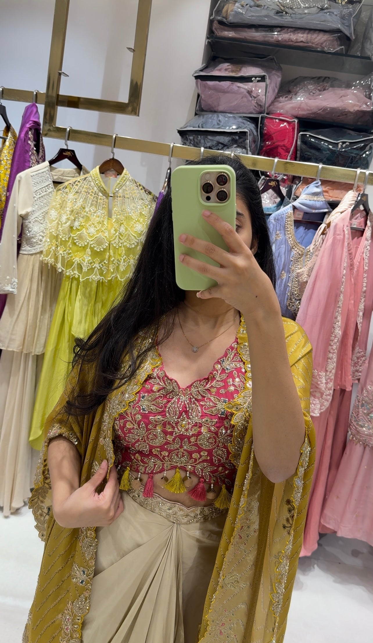 Cream Cowl Skirt Pink Blouse and Shrug With Embroidery Western Look Outfit