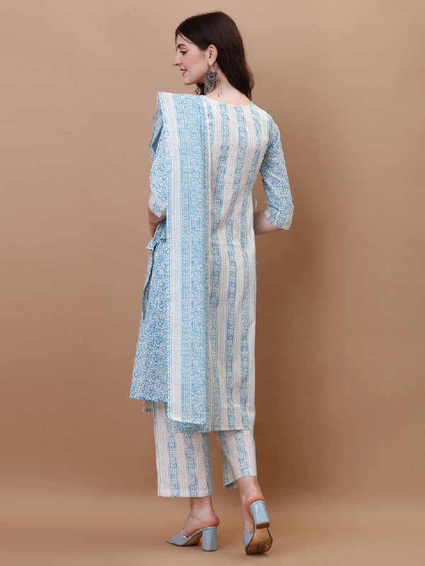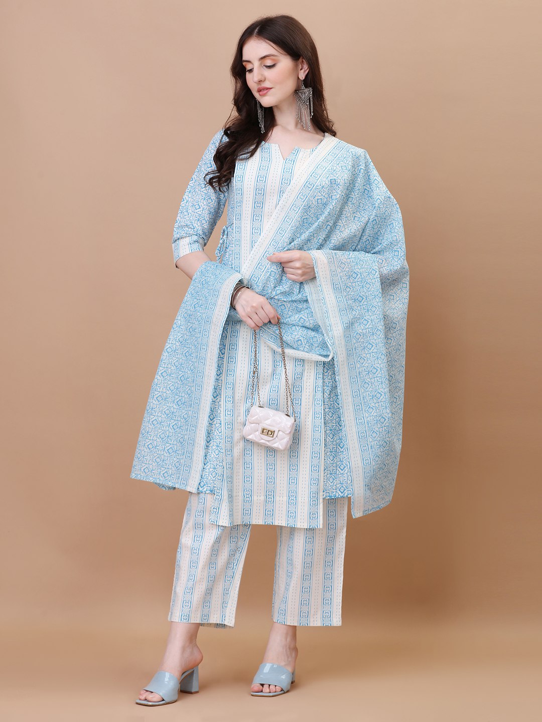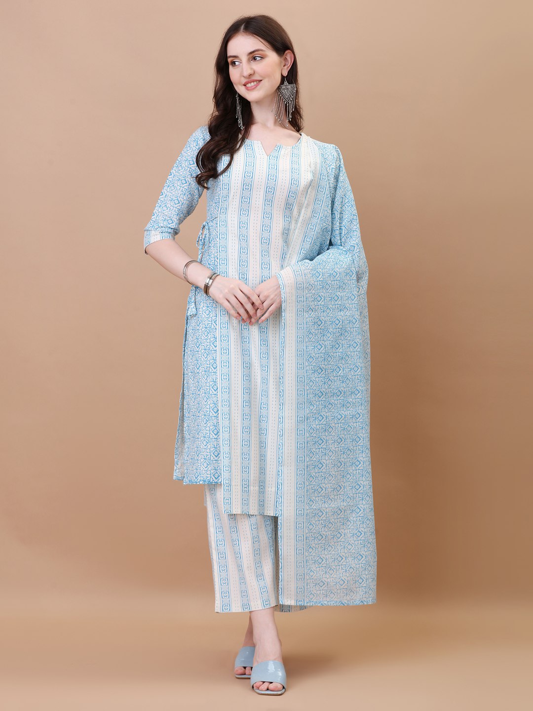 This stylish and comfortable Kurta Set is crafted from soft cotton printed fabric, featuring a round neck and a straight kurti with a divider plaza. The set includes a matching cotton dupatta and a fully stitched bottom, making it an ideal choice for casual and semi-formal occasions.