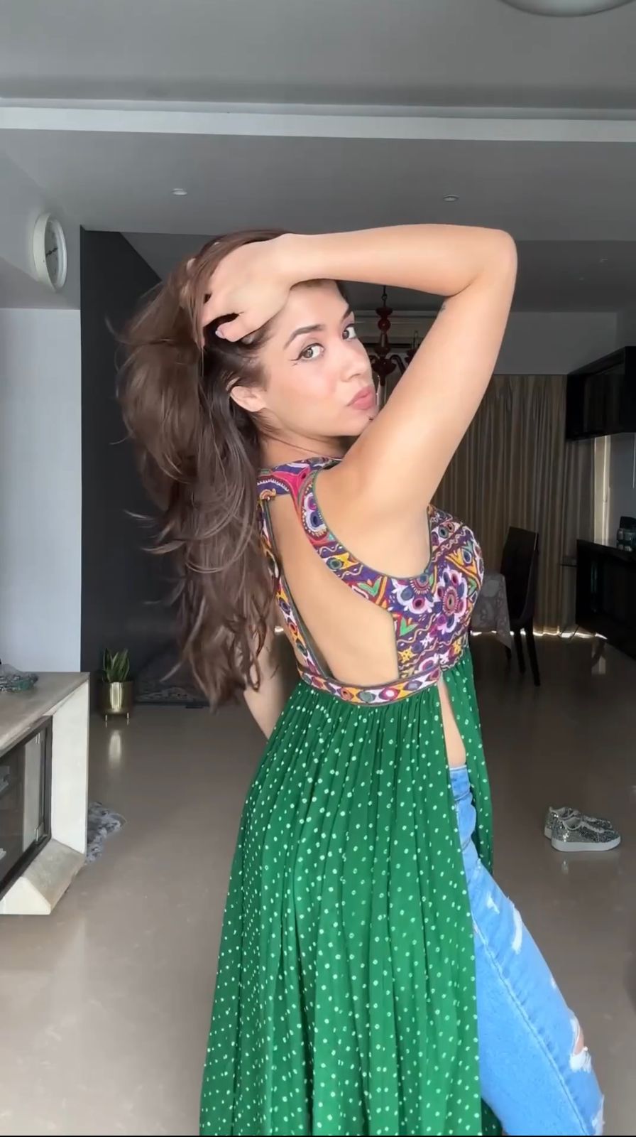 Green Bandhani Printed Mirror Work Kurti