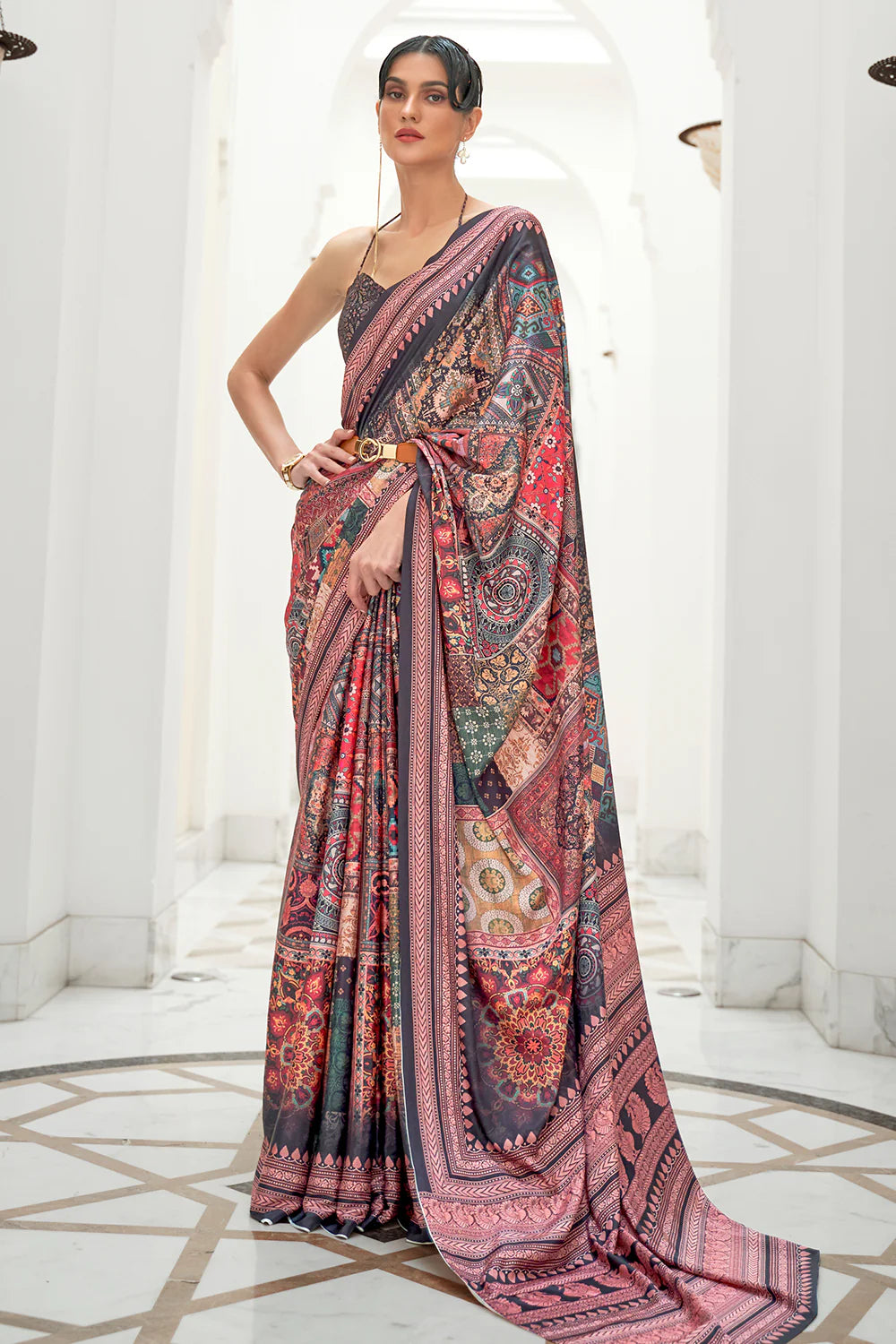 A satin saree with digital prints is a ultimate blend of ethnic elegance and modern flair. Satin is a light weight and smooth fabric that has a lustrous sheen, making it complete for creating a glamorous look.