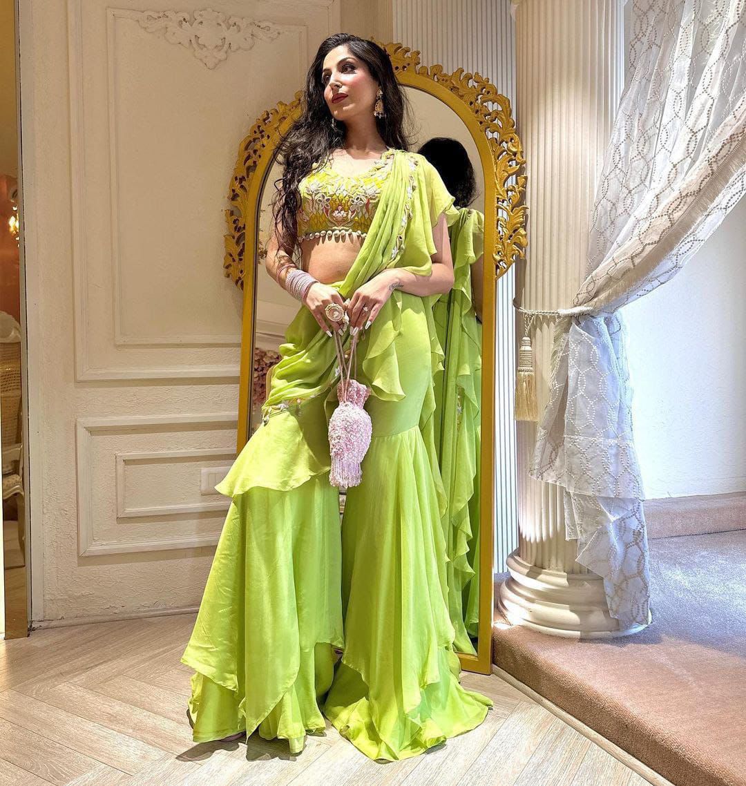 A green ruffle saree is a mesmerizing blend of traditional elegance and contemporary flair. Crafted from luxurious fabric in a lush green hue, this saree boasts delicate ruffles cascading gracefully along its length, adding movement and drama to every step. The vibrant colour exudes freshness and vitality, while the ruffles infuse a playful and modern touch to the classic drape. Whether worn for a festive occasion or a special event, this saree effortlessly captures attention and radiates sophistication, making it a timeless addition to any wardrobe.