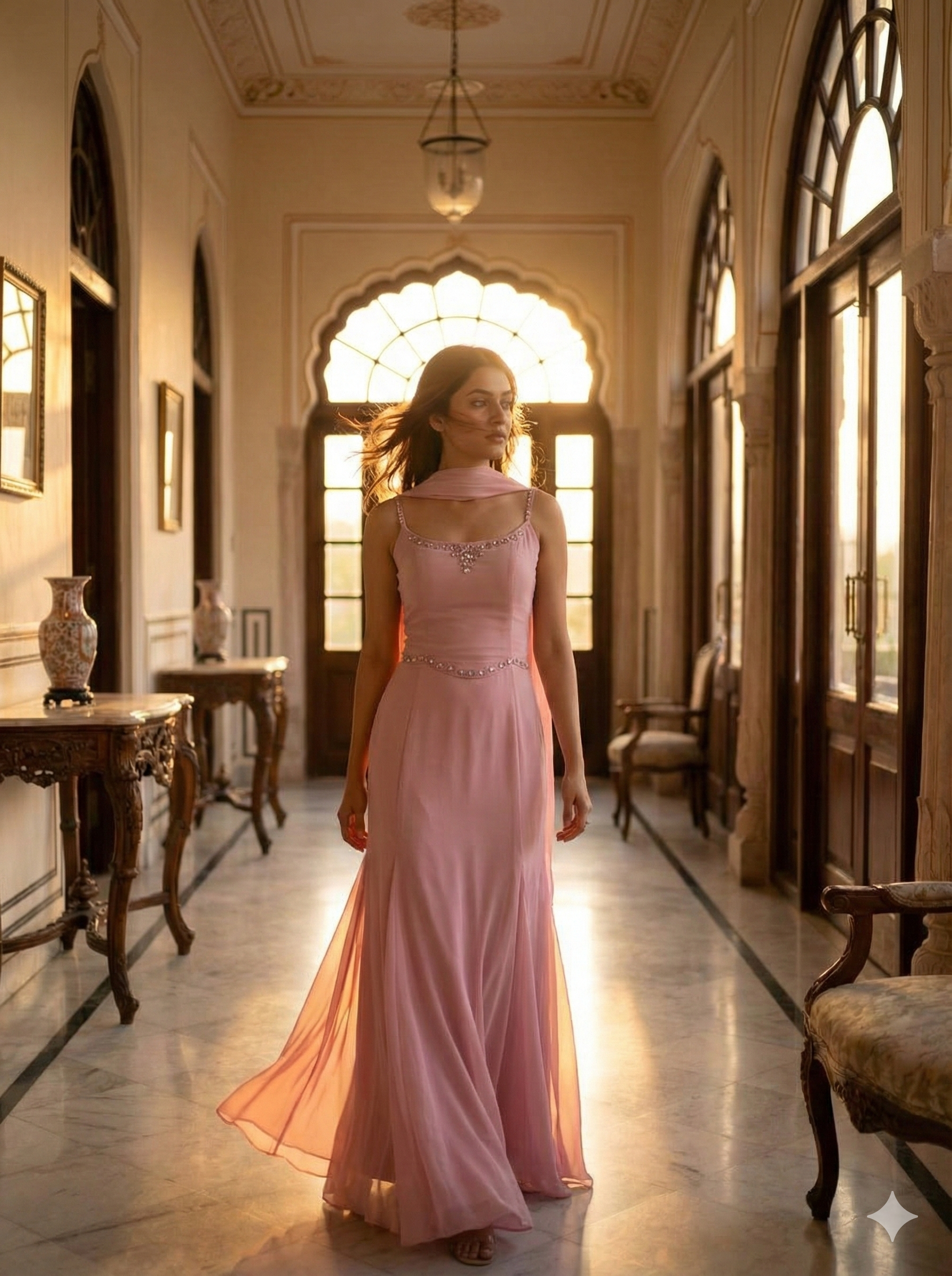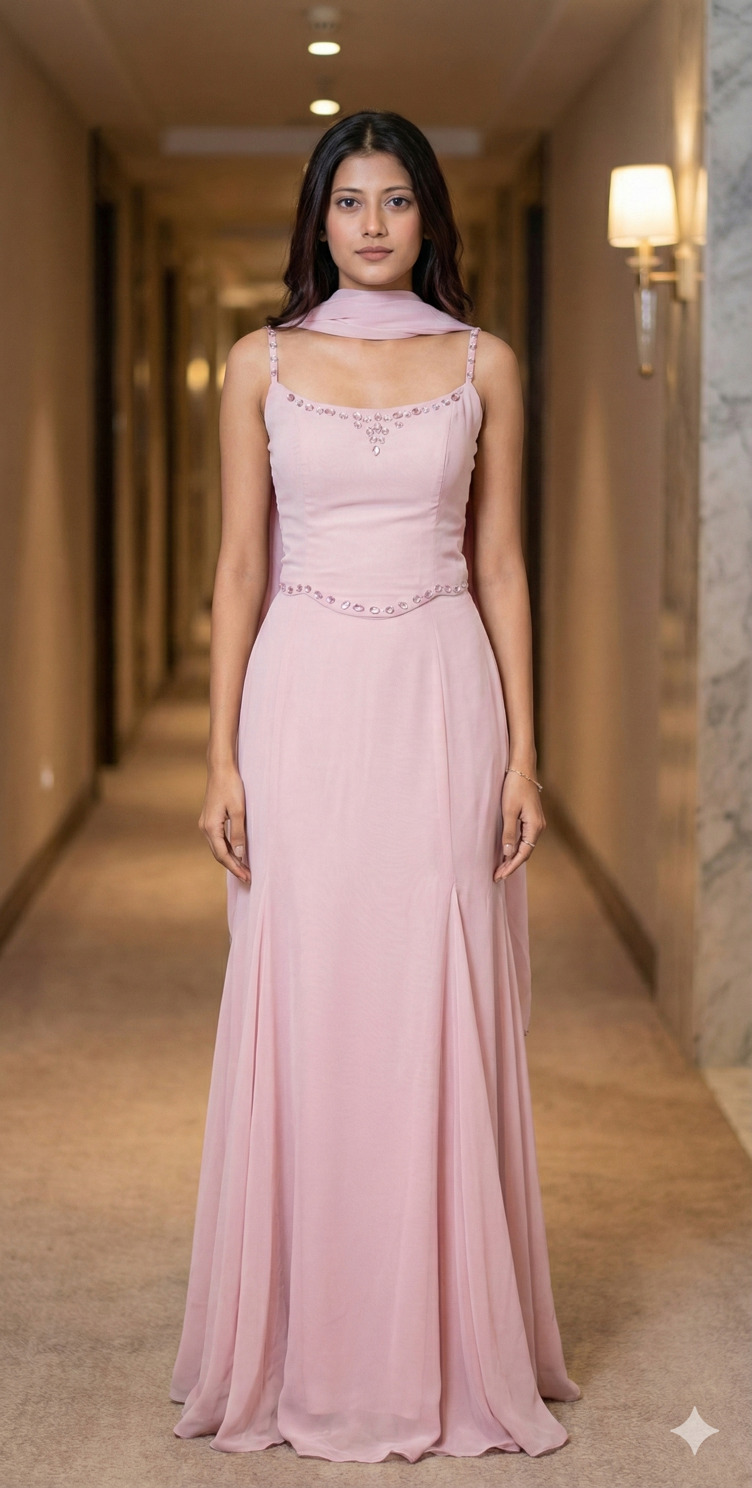 Pearl-Detail Pink Aura Evening Gown is crafted to make a statement at every special occasion. Designed in a soft pink aura hue, it features delicate pearl detailing that adds timeless elegance. The flattering silhouette flows effortlessly, enhancing your natural shape with grace. Perfect for gala nights, cocktail evenings, and elegant celebrations where sophistication is key.
