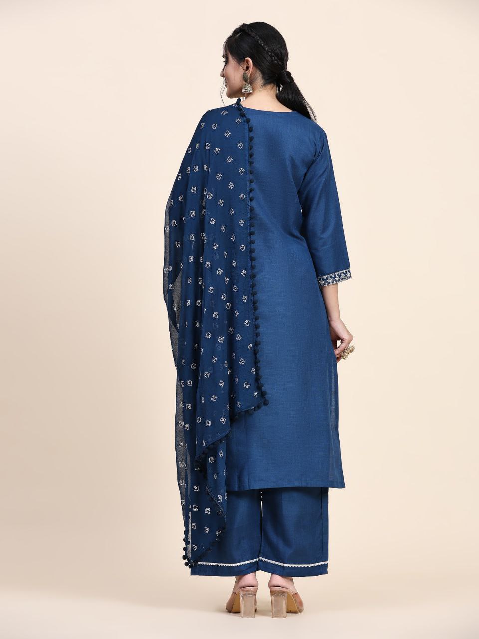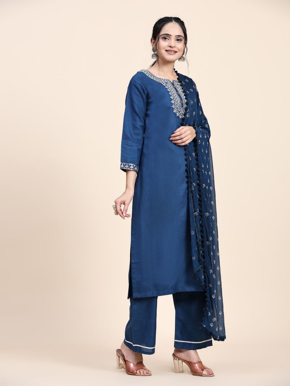 This elegant Designer Kurta Suit Set in a beautiful Rama color is crafted from heavy Muslin fabric, featuring intricate embroidery work and a comfortable cotton inner. The set includes a Kurta, Bottom, and Dupatta, making it a perfect choice for both style and comfort on any special occasion.