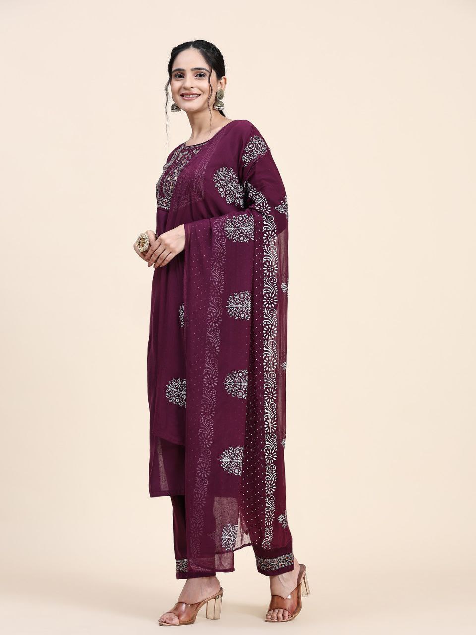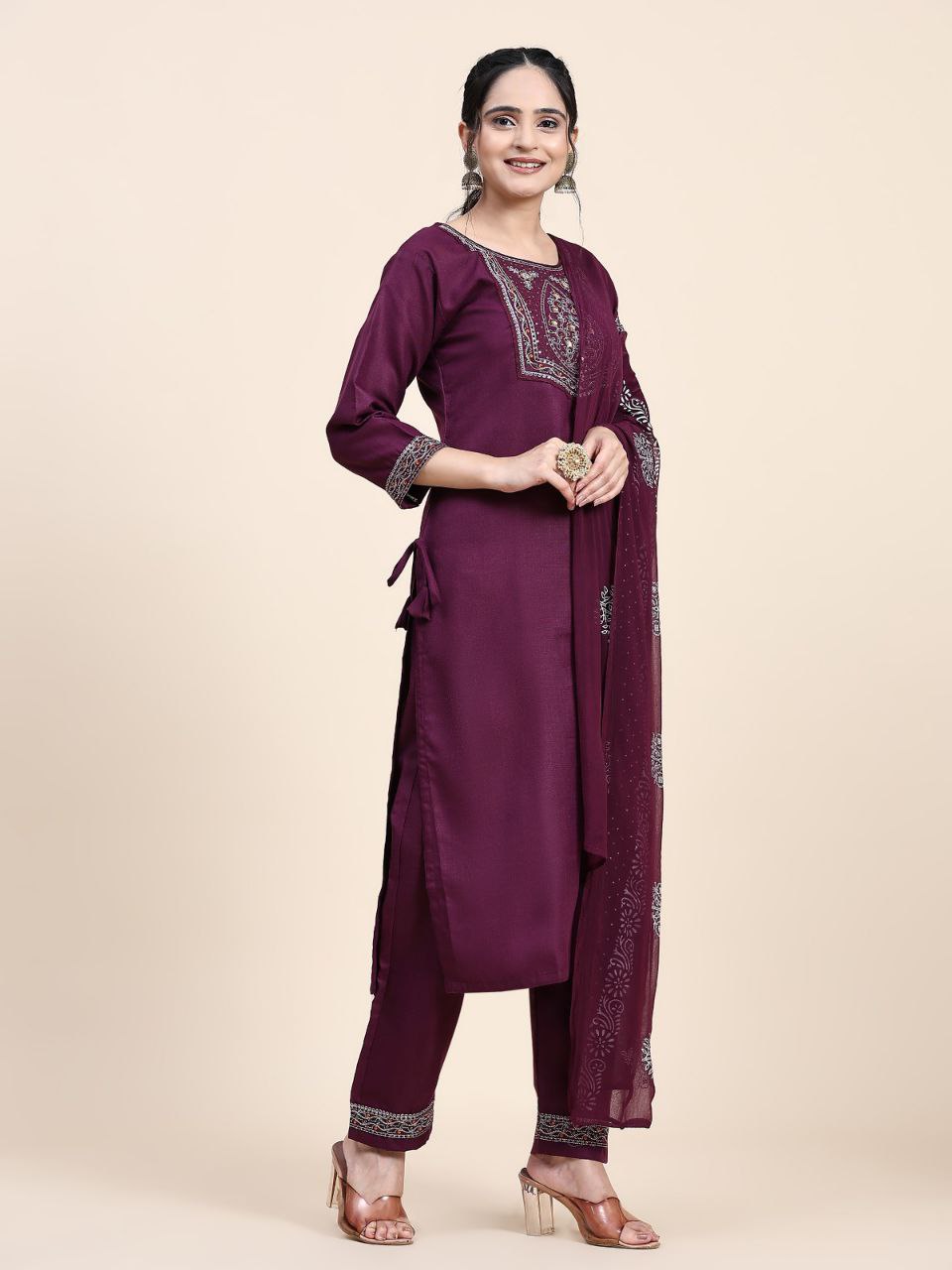 This exquisite Designer Kurta Suit Set in a rich wine color is crafted from heavy Muslin fabric and features a comfortable cotton inner. The set showcases beautiful embroidery on the top, subtle embellishments on the bottom, and a printed heavy Nazmeen dupatta, making it a perfect choice for any occasion.