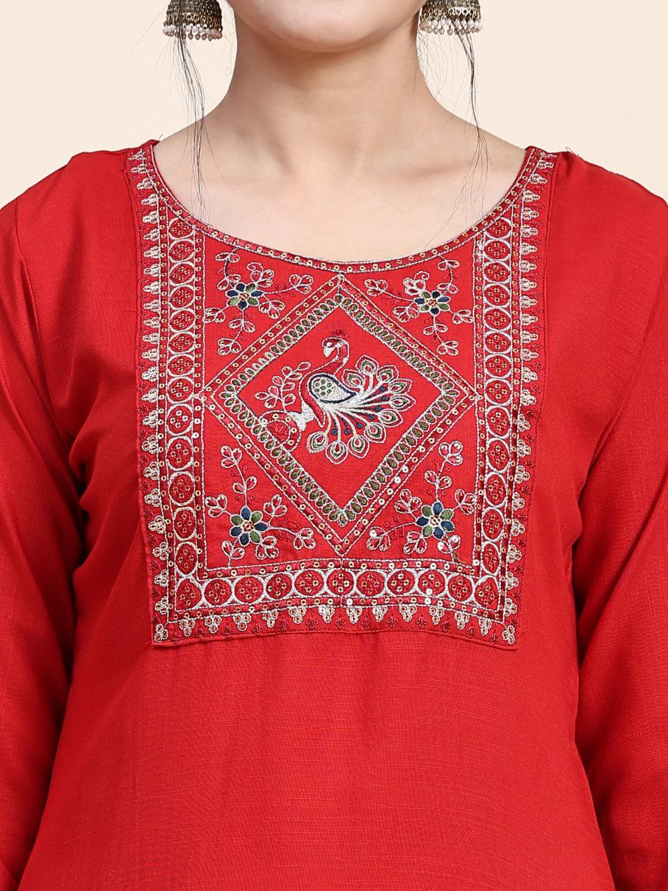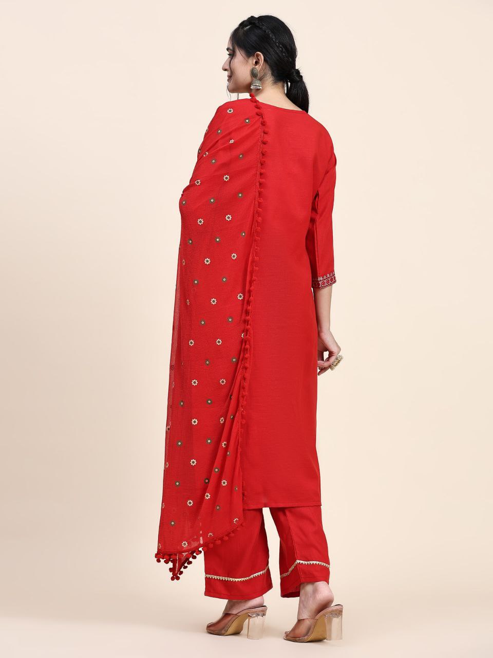 This stunning Designer Kurta Suit Set in vibrant red is made from heavy Muslin fabric, complemented by a comfortable cotton inner. Featuring intricate embroidery and subtle embellishments, this set is perfect for any special occasion.
