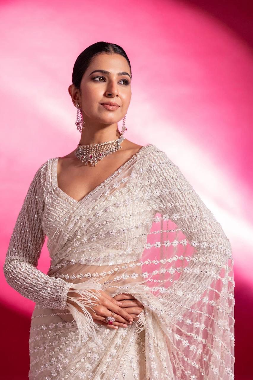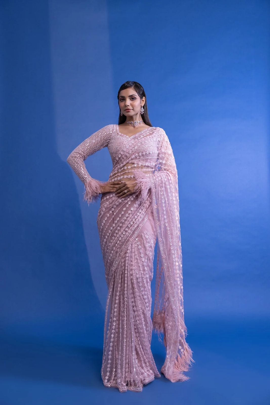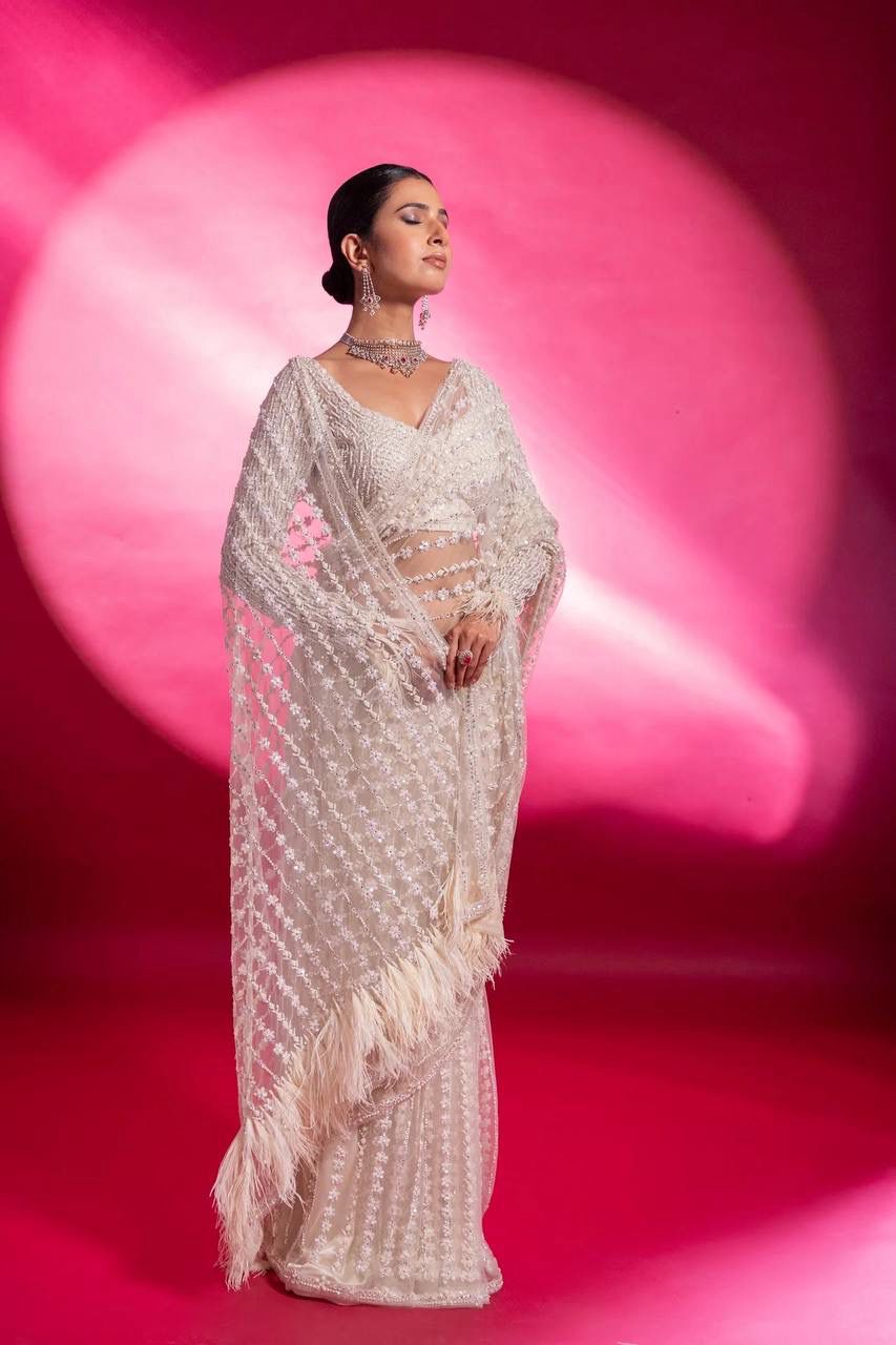 Net saree with elaborate milky rainbow sequence and thread work, featuring jhalar border detailing. Includes satin inner lining.